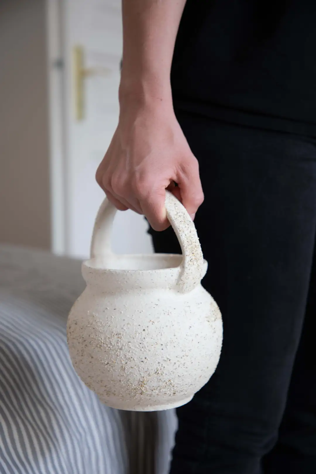 V mém projektu nejde pouze o odkaz na místo, kam byla žena i s miminkem v minulosti ukládána, či na koutní hrnec samotný, ale i o to, jak se téma šestinedělí a prožitků žen v tomto období v současnosti upozaďuje, vytlačuje „do kouta“. Ženy bezprostředně po porodu dnes již nedodržují požadavek striktní izolace a nejsou omezovány množstvím pověr, to však neznamená, že se v tomto období nepotýkají s celou řadou těžkostí. Projekt V koutě je postaven na myšlence, že skrze artefakt koutního hrnce lze sdělovat nejrůznější obsahy: strachy, krize, bolesti, radosti i pocity vděčnosti. Vytvořila jsem proto soubor koutních hrnců ztvárňujících konkrétní prožitky a stavy konkrétních žen v průběhu šestinedělí. Součástí projektu jsou pak i rozhovory s těmito ženami, které jsou důkazem reálných, často palčivých problémů, jimž jsou dnes ženy po porodu vystaveny.